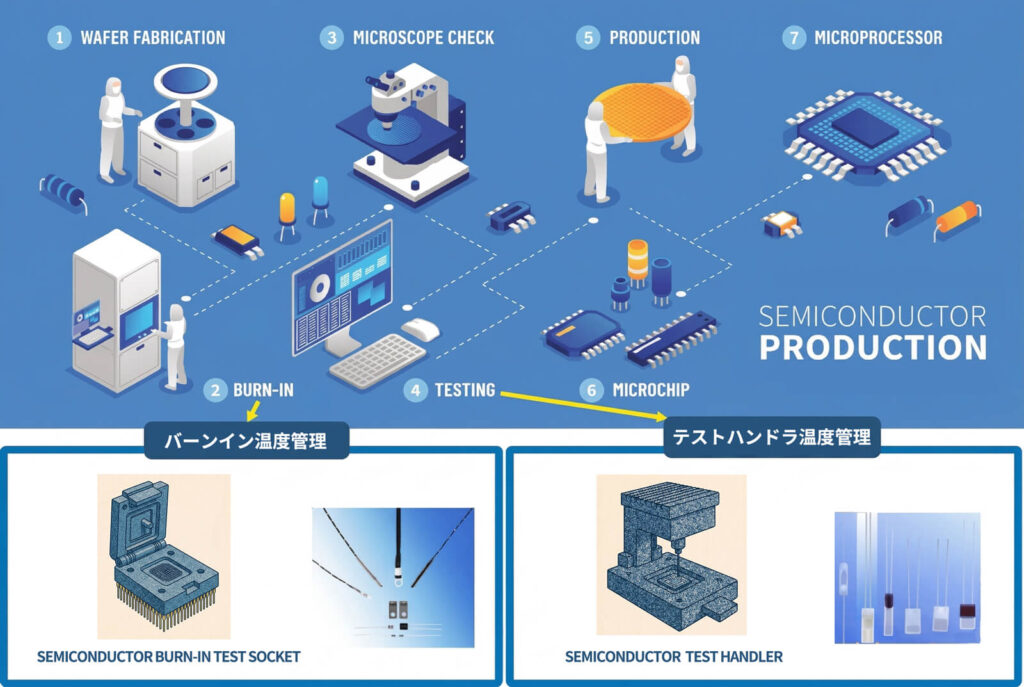 半導体プロセスはベースとなるSiウエハの上に何層も何層もパターンや半導体層を重ねて完成品のチップを作っています。大きなSiウエハに何回もフォトリソグラフィー工程を繰り返しながら作成するため、長い時間と大きなコストがかかり半導体は高価になります。その高価な半導体チップの歩留りを少しでも上げるためには完成品での特性測定や検査の精度を上げる必要がありそこに高精度の白金温度センサが活きてきます。特にチップを発熱させる検査工程では白金温度センサを使用すると精密に温度を測定しながらチップに負荷をかけることができます。白金温度センサの高精度・広温度範囲の特性を活かせるアプリケーションです。